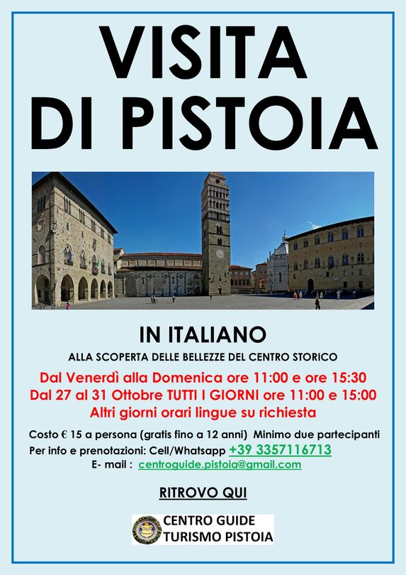 INFO e PRENOTAZIONI: Centro Guide Turismo Pistoia +39 335 7116713 centroguide.pistoia@gmail.com
